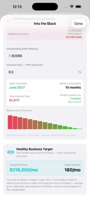 - Into the Black — your exact break-even number, debt payoff timeline & surplus plan