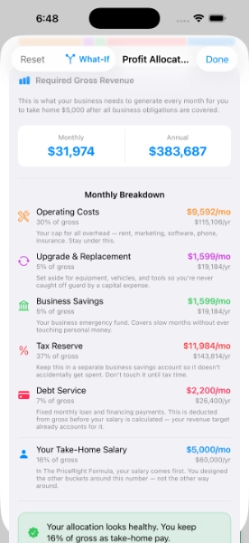 Into the Black runs the whole picture. Your salary. Your allocations. Your taxes. Your debt. It calculates the exact monthly revenue your business needs to cover every obligation you carry, how many jobs that requires at your average sale price, and whether you're currently above or below that line.